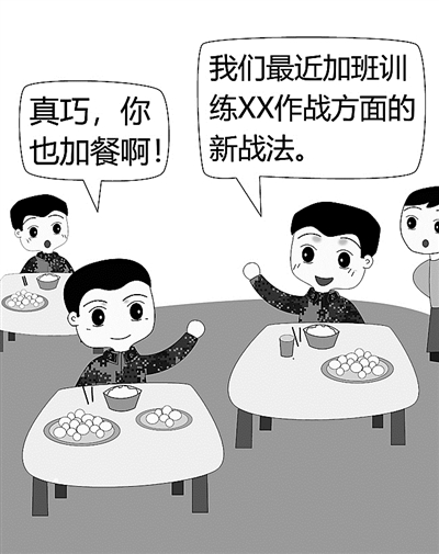 ????“真巧,你也來(lái)加餐啊。”“是啊,我們營(yíng)最近在研訓(xùn)新戰(zhàn)法,有時(shí)會(huì)加班訓(xùn)練……我跟你說(shuō),我們研究的新戰(zhàn)法主要是××作戰(zhàn)方面,據(jù)說(shuō)要在全旅推廣呢!”