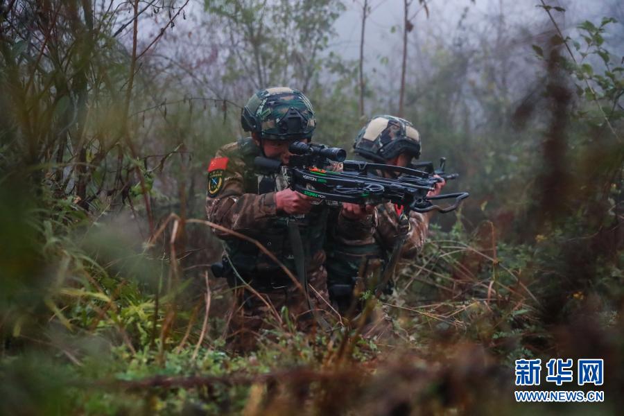 武警貴州總隊六盤水支隊特戰隊員在山林地捕殲戰斗中用弓弩射擊(12月10日攝)。新華社發(康夫寶 攝)
