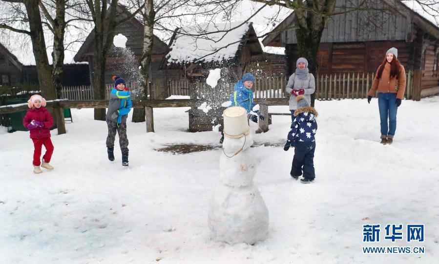 1月24日,孩子們在白俄羅斯首都明斯克郊區的民族建筑博物館內打雪仗。新華社發(任科夫攝)