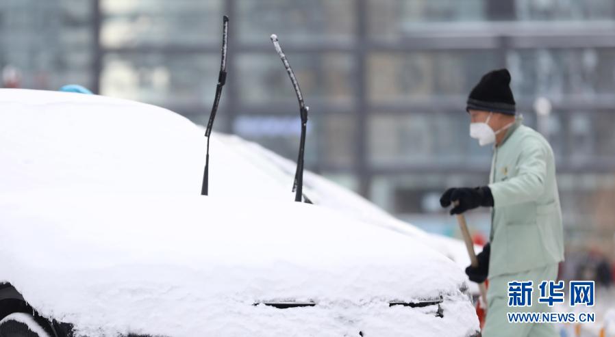 1月28日,在沈陽市渾南區(qū),一名工作人員清掃停車場(chǎng)積雪。