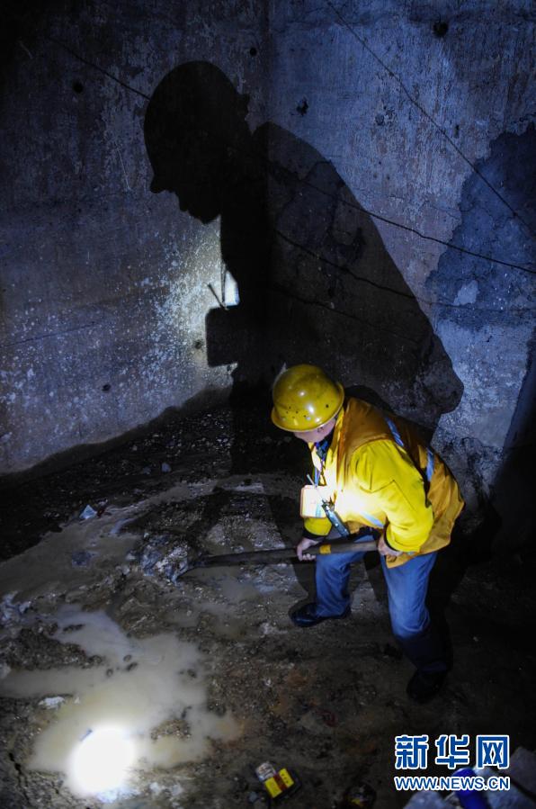 看守工廖成根清理鄧山隧道內排洪溝的淤泥(1月30日攝)。