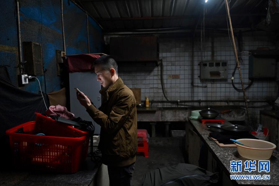 1月26日,在福建省石獅市的金利萊斯服裝廠,黃海龍在廚房用手機查看剛剛收到的工資明細。這一年他們夫妻每天工作超過12小時,收入合計約16萬。