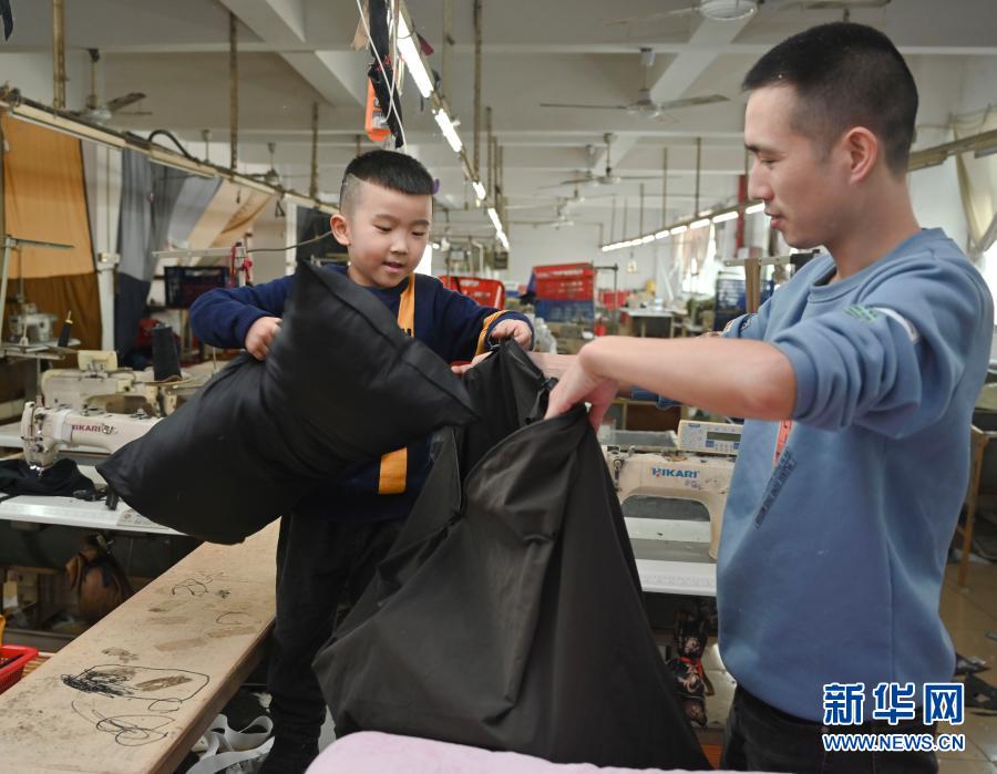 1月26日,在福建省石獅市的金利萊斯服裝廠,聰聰和爸爸一起將給老家親人做的枕頭裝好。