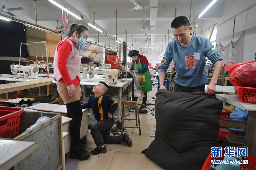 1月26日,在福建省石獅市的金利萊斯服裝廠,黃海龍在收拾準備寄給老家親人的自制枕頭等禮物,聰聰在一旁纏著媽媽玩耍。