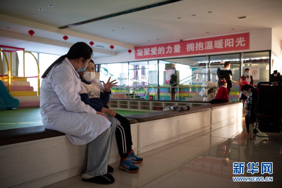 在哈爾濱博能中醫(yī)門(mén)診部,劉雨晴(左)和腦癱兒童交談(2月2日攝)。