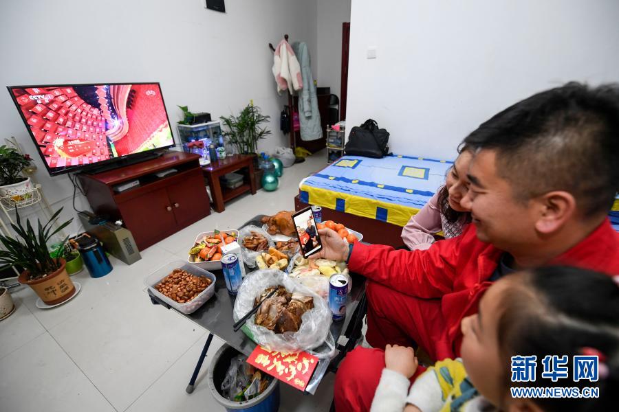 2月11日除夕夜,王濤(中)和妻子女兒在宿舍同在銀川的父母和2歲的兒子通視頻電話。