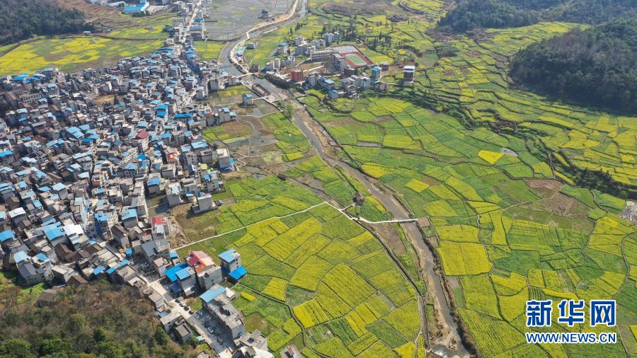 2月14日在貴州省黔東南苗族侗族自治州黎平縣拍攝的油菜花田(無人機照片)。新華社發(fā)(李長華 攝)