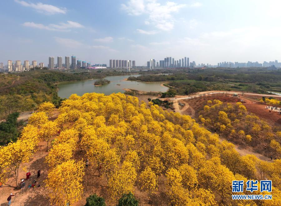 近日,廣西南寧市青秀山風景區黃花風鈴木盛放,吸引眾多游人前來觀賞。