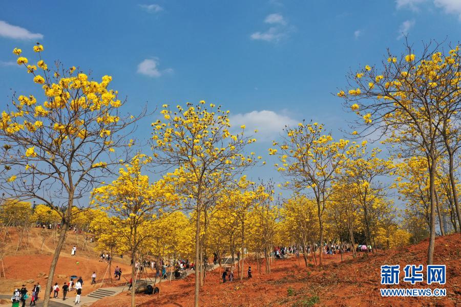 近日,廣西南寧市青秀山風景區黃花風鈴木盛放,吸引眾多游人前來觀賞。