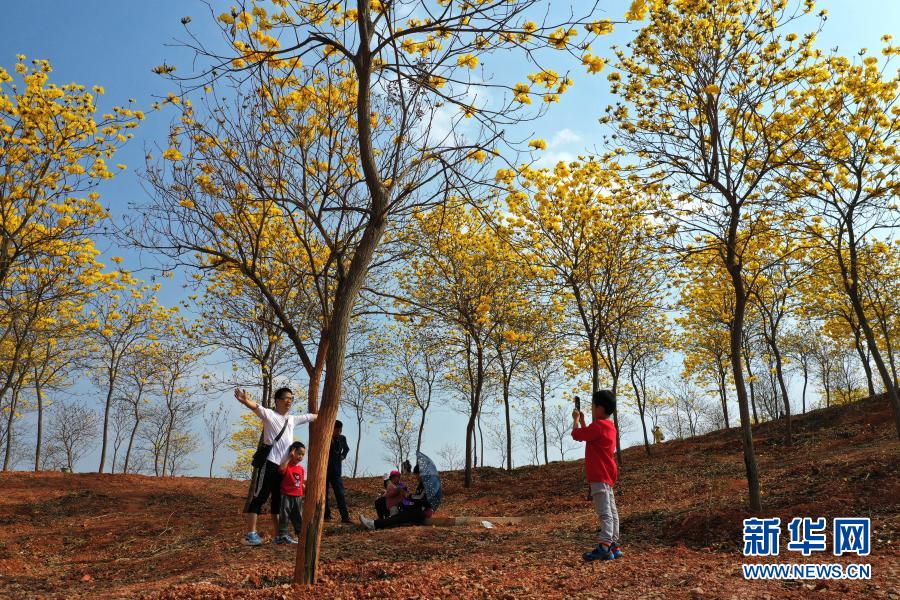 2月21日,游人在南寧市青秀山風景區觀賞盛開的黃花風鈴木。