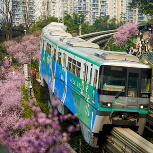 初春時節,重慶氣溫逐漸回暖,暖陽里的山城春意盎然。在重慶軌道交通2號線佛圖關段,山城步道上的梅花簇簇綻放,單軌列車穿越花海,組成一幅賞心悅目的獨特城市景觀。