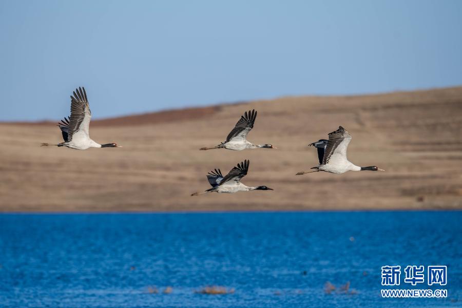 黑頸鶴在大山包黑頸鶴國家級自然保護區飛翔(2月24日攝)。新華社記者 胡超 攝