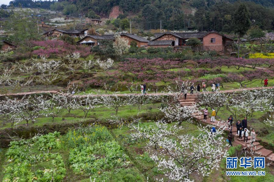 3月1日,游客在幸福古村里游玩(無人機照片)。新華社記者 江宏景 攝