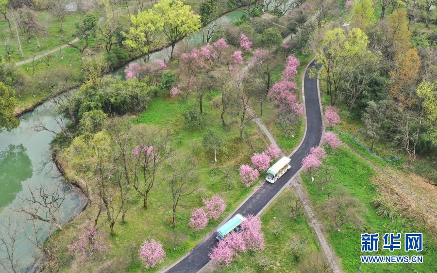 3月2日,觀光車在西溪濕地內行駛(無人機照片)。