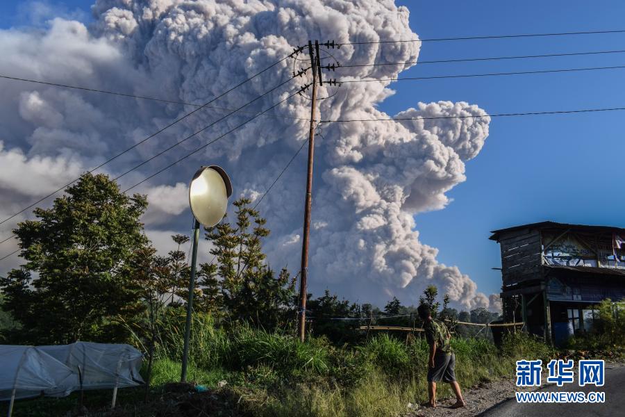3月2日,一名男子在印度尼西亞北蘇門答臘省卡羅觀看噴發(fā)的錫納朋火山。新華社發(fā)(森比林?jǐn)z)