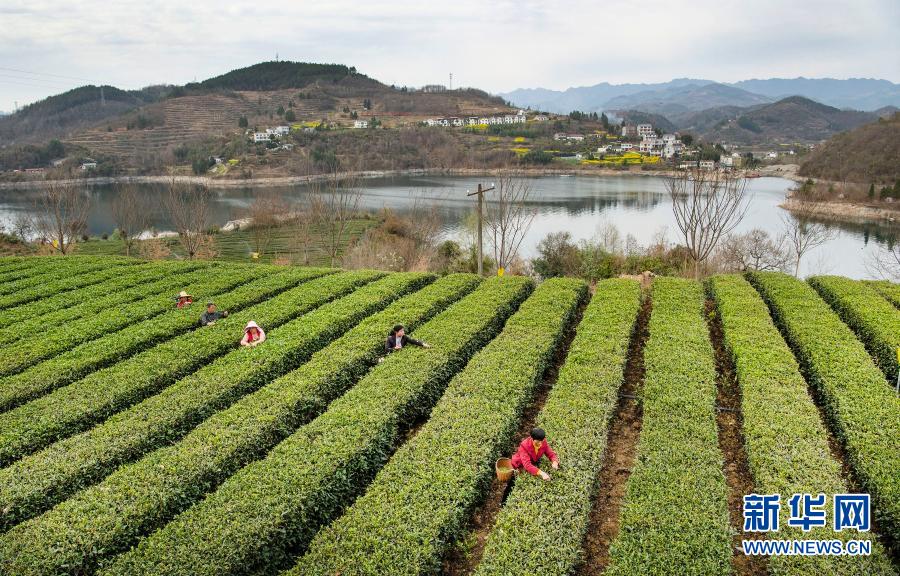3月4日,茶農在安康市漢濱區流水鎮剛子茶葉專業合作社標準化茶園采摘新茶(無人機照片)。新華社記者 陶明 攝