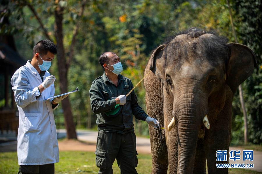 “象爸爸”為一頭名叫“小強”的大象測量胸圍(3月6日攝)。新華社記者 江文耀 攝