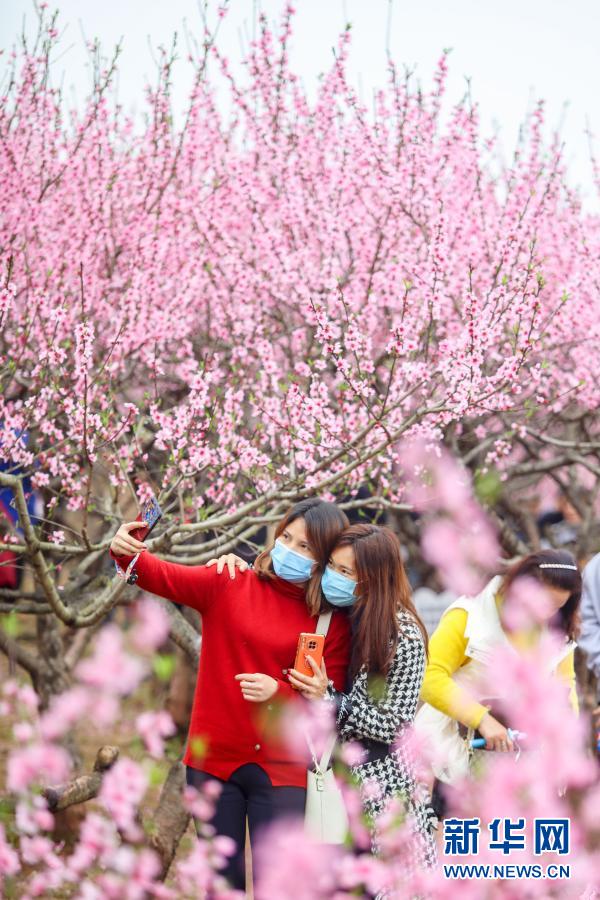 3月8日,四川省遂寧市大英縣卓筒井鎮為干屏村桃花盛開,踏青賞花的游客在花前自拍。