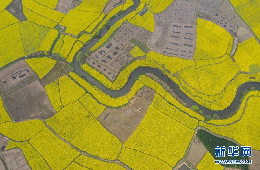 安州區樂興鎮蓮花村的油菜花海(3月14日攝,無人機照片)。新華社記者 江宏景 攝