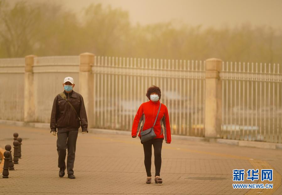 3月15日,行人從北京北海公園附近經過。當日,我國北方多地出現沙塵天氣。新華社記者 陳曄華 攝