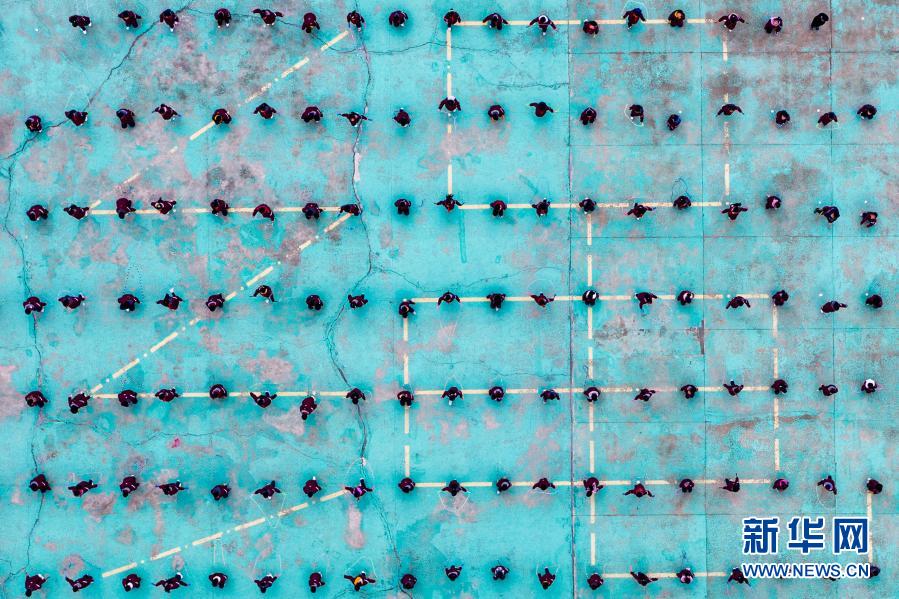 騎路小學(xué)學(xué)生們在大課間進(jìn)行跳繩鍛煉(3月9日攝,無人機照片)。新華社記者 李博 攝