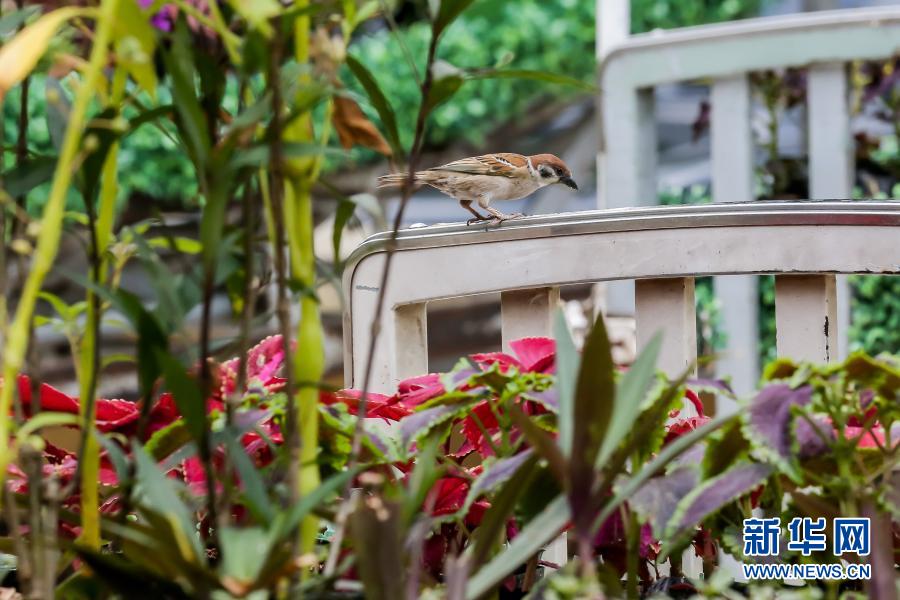 3月18日,在位于馬尼拉的菲律賓大學附屬菲律賓總醫院,一只麻雀站在“低語的花床”藝術裝置上。