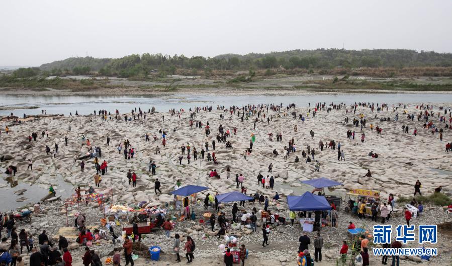 3月21日,涪江江油市青蓮鎮中河村段的石灘吸引眾多游客。