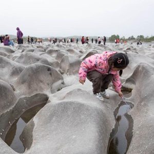 冬春枯水期,四川省涪江江油市青蓮鎮中河村段,約 5000 余平方米的石灘露出水面。石灘凹凸不平,好似起伏的山巒,每天吸引眾多游人前來游玩。據專家解釋,這種壺穴地貌景觀是由涪江河床的基巖經水中裹挾的礫石長時間沖刷、磨蝕而成。