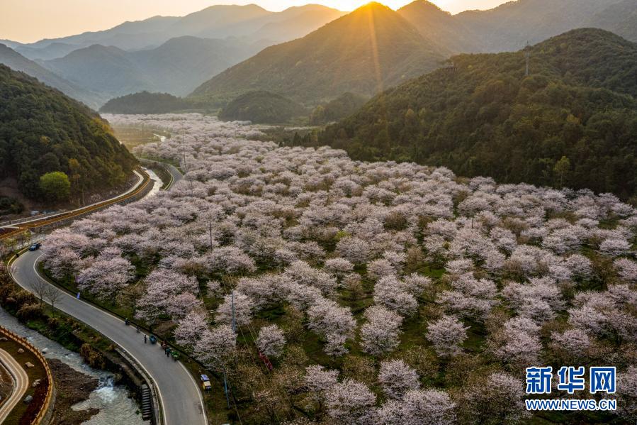 近日,位于浙江省紹興市上虞區章鎮鎮張村櫻花谷大片櫻花綻放,花香四溢,吸引游人前來踏青賞花。