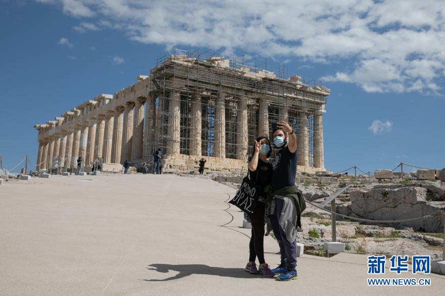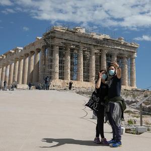 3月22日,游客在希臘雅典衛城自拍。希臘露天考古遺跡22日起恢復開放。游客需遵守保持社交距離和佩戴口罩等防疫規定。新華社發(萊夫特里斯·帕察里斯攝)