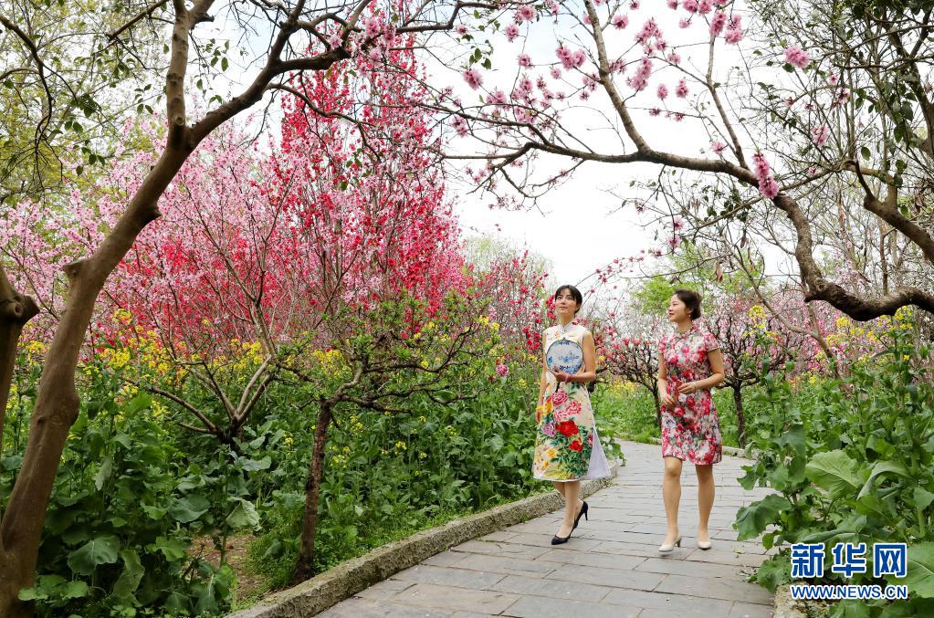 3月26日,“春暖浦東 十里桃花”2021上海桃花節開幕儀式在浦東南匯惠南鎮桃花村舉行,兩名當地旗袍協會的姑娘在桃花村賞花。