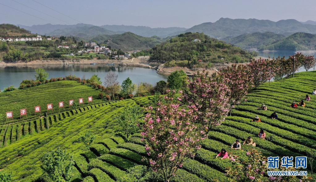 3月28日,流水鎮剛子茶葉專業合作社的社員在采摘新茶(無人機照片)。