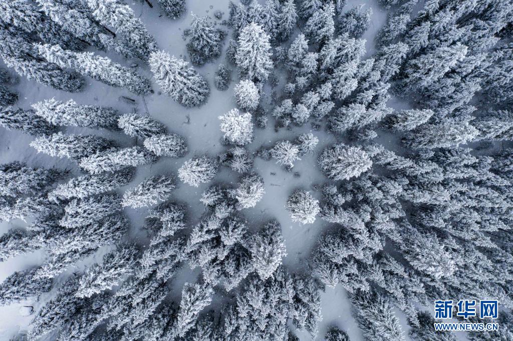 3月30日,大雪降落在新疆沙灣市鹿角灣的雪嶺云杉森林間(無人機照片)。