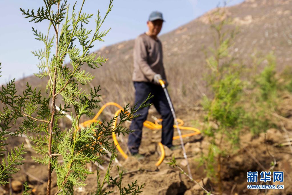 3月31日,造林隊員在河北省遵化市石門鎮金星山給新栽的樹苗澆水。