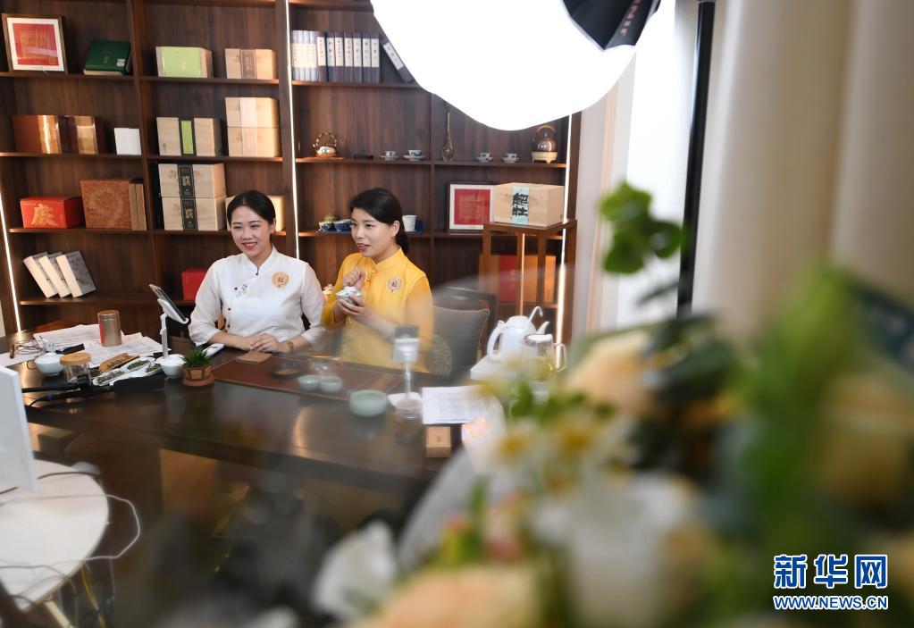 4月1日,主播在福鼎市一家茶企業直播間講解白茶和演示品飲技巧。新華社記者 林善傳 攝