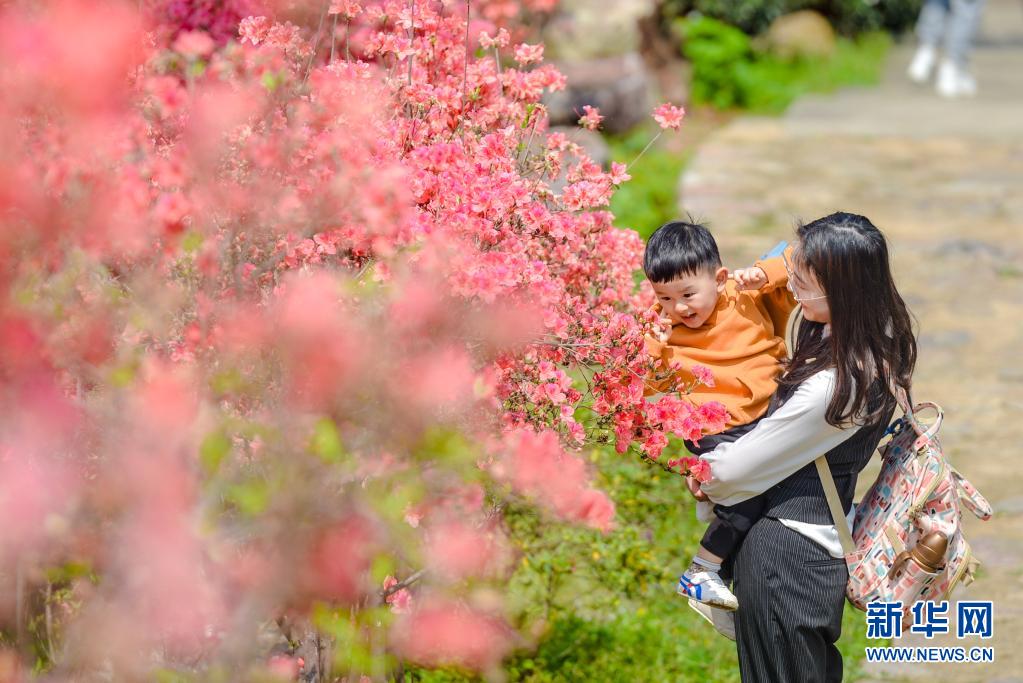 4月5日,一對(duì)母子在浙江省湖州市長興縣和平鎮(zhèn)城山溝景區(qū)內(nèi)觀賞杜鵑花。