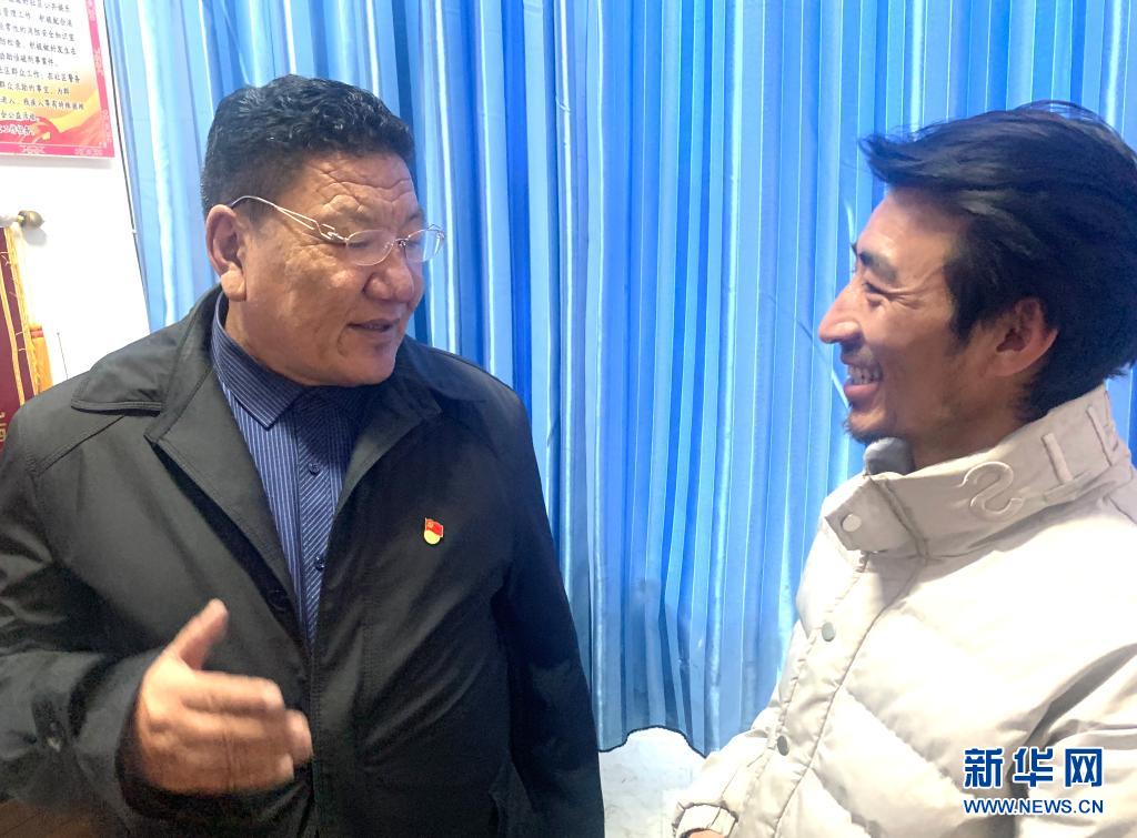 青海省玉樹藏族自治州玉樹市加吉娘生態移民社區黨支部書記土丁朋措(左)和社區工作人員交流(4月12日攝)。