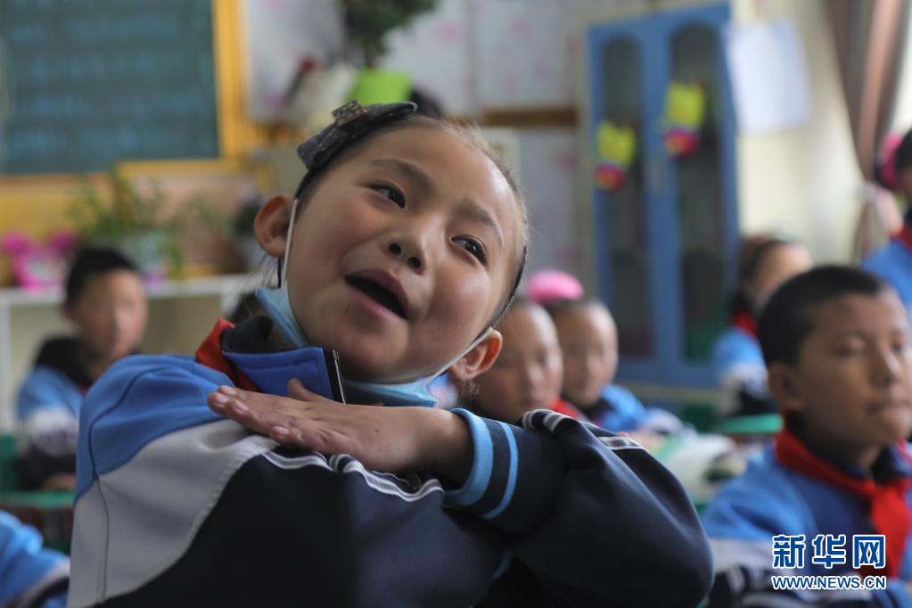 青海省玉樹藏族自治州玉樹市第三完全小學的學生才卓瑪在課堂上(4月12日攝)。