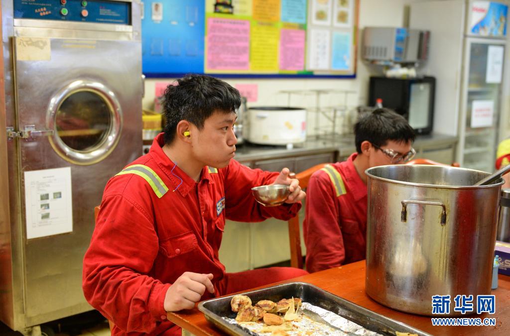 4月25日,中國海油樂東15-1氣田的工人在工間休息時(shí)用餐。