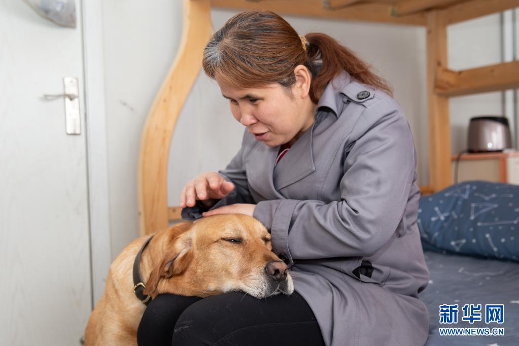 導(dǎo)盲犬“多多”經(jīng)常會(huì)把頭放在祝愛葉腿上,祝愛葉一邊撫摸著它的頭一邊和它說說心里話(4月26日攝)。 新華社發(fā) (張夢(mèng) 攝)