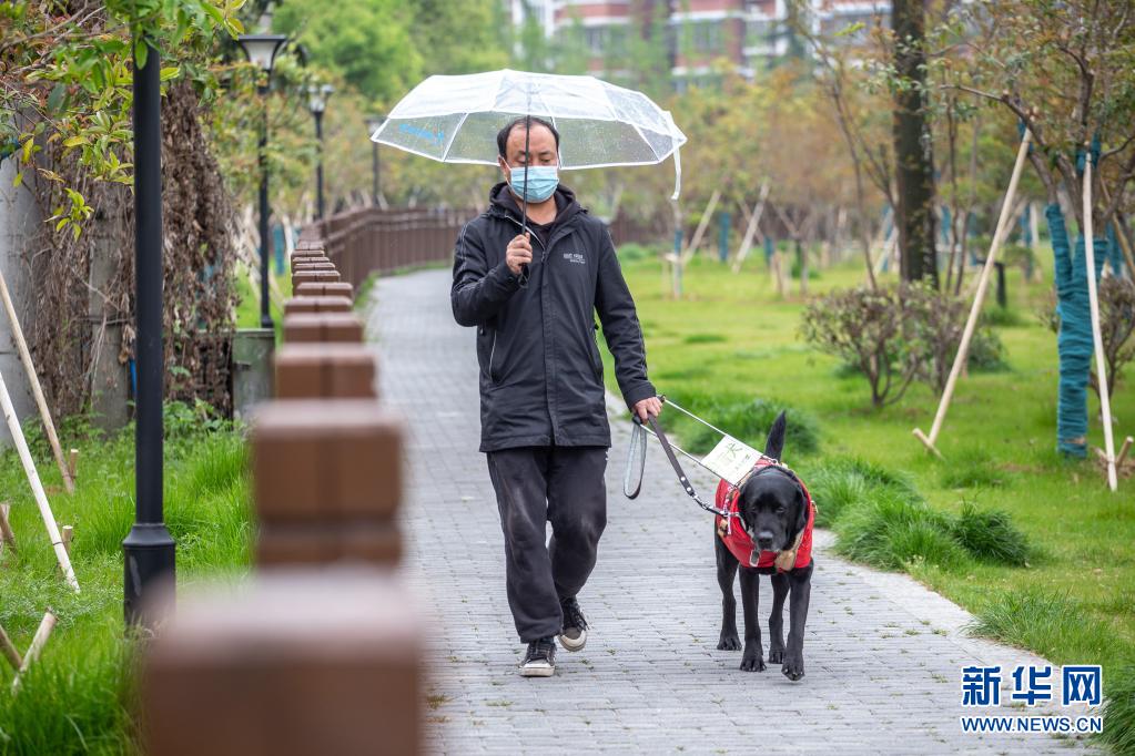 吳虎剛今年45歲,和同是盲人的妻子經營著一家盲人推拿診所。每天上班,導盲犬“C羅”都會陪伴吳虎剛從家走到診所(4月11日攝)。 新華社發 (張夢 攝)