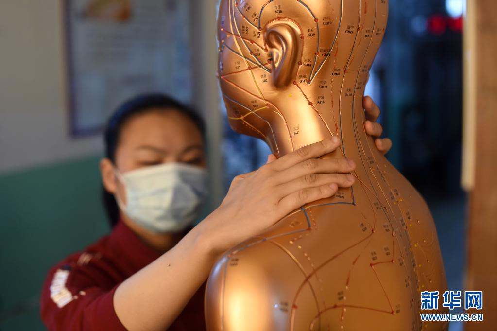 4月28日,葉景芬在自己實習的龍泉市中醫院內感受中醫針灸穴位。新華社記者 韓傳號 攝