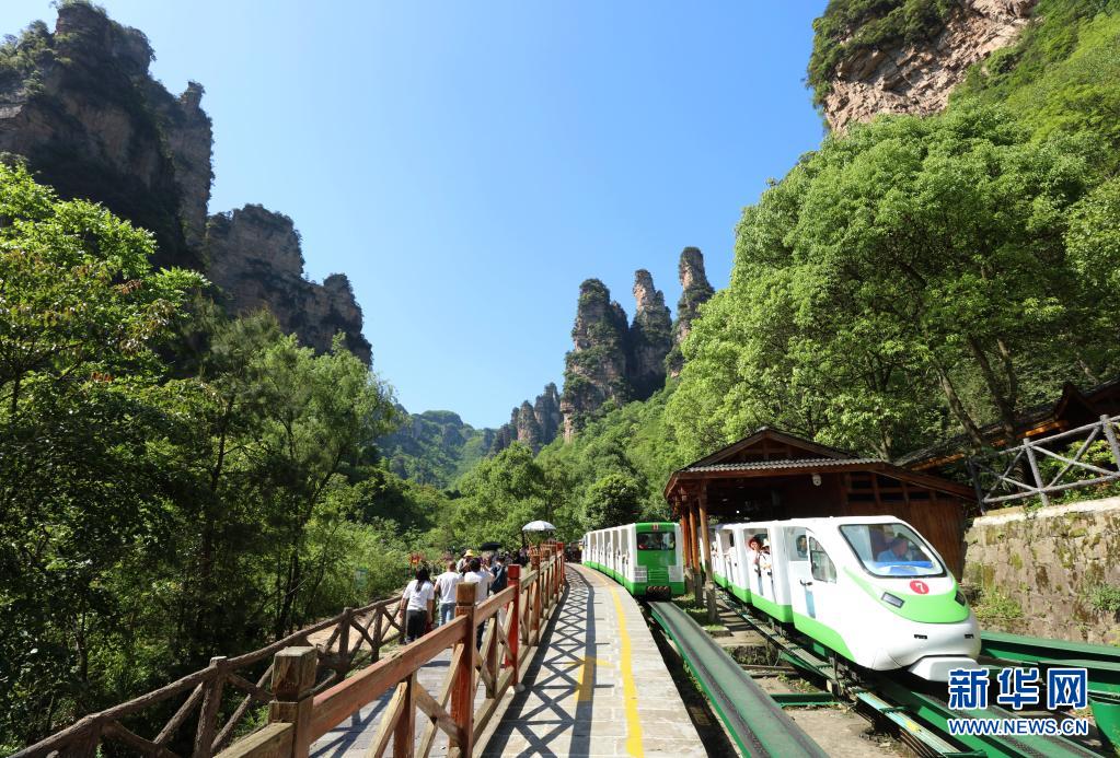 5月1日,游人乘觀光電車在湖南省張家界市武陵源區十里畫廊景區游玩。