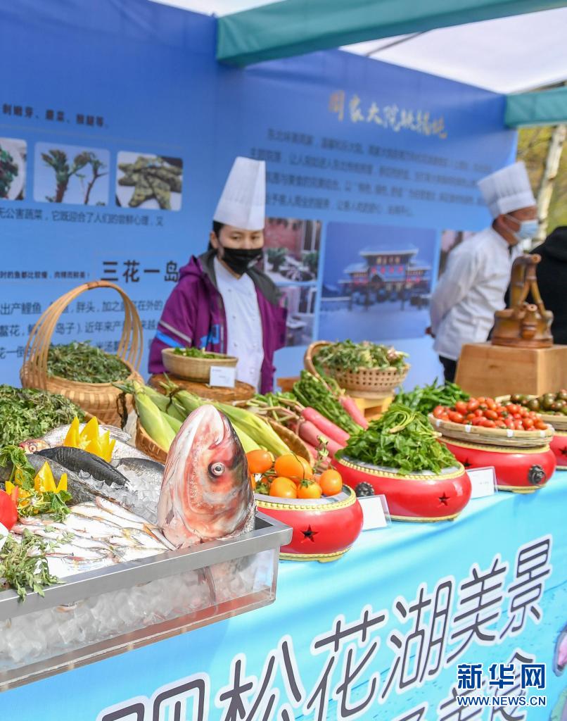 5月1日,在吉林市萬(wàn)科松花湖度假區(qū)夏季運(yùn)營(yíng)啟幕儀式現(xiàn)場(chǎng),廚師展示開江魚和山野菜等當(dāng)?shù)靥厣朗场?/p>