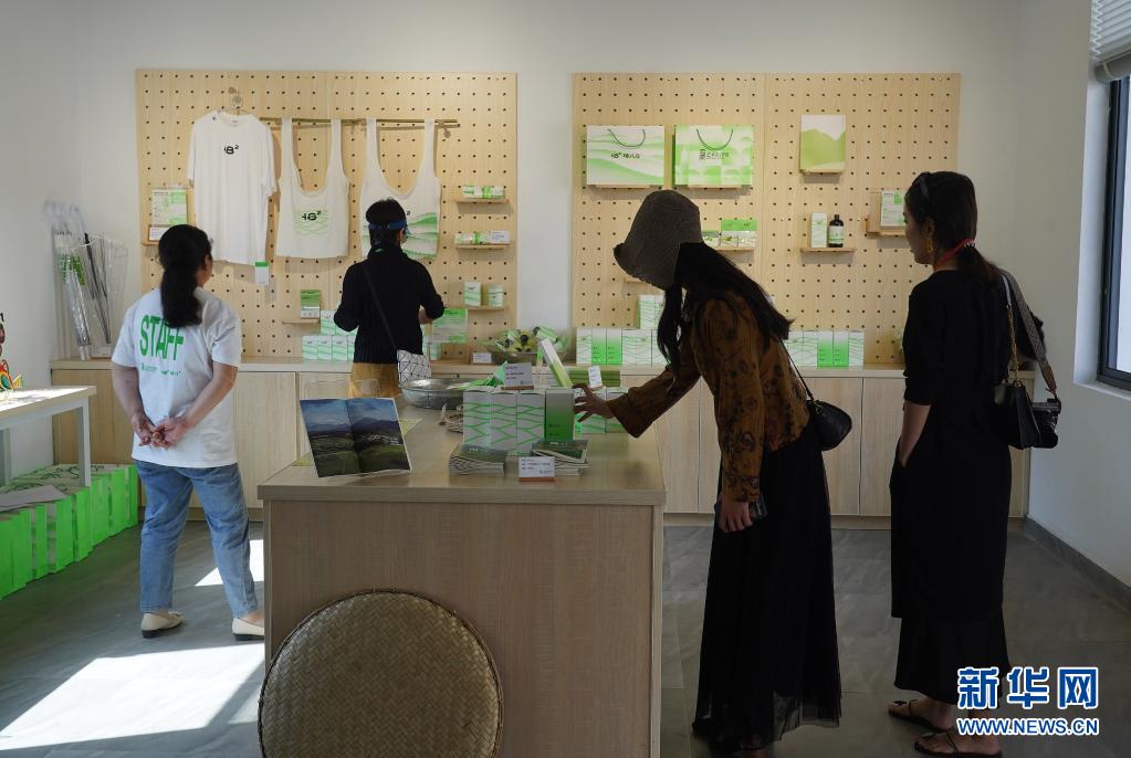 5月1日,參觀者在浮梁縣寒溪村挑選藝術展文創用品。