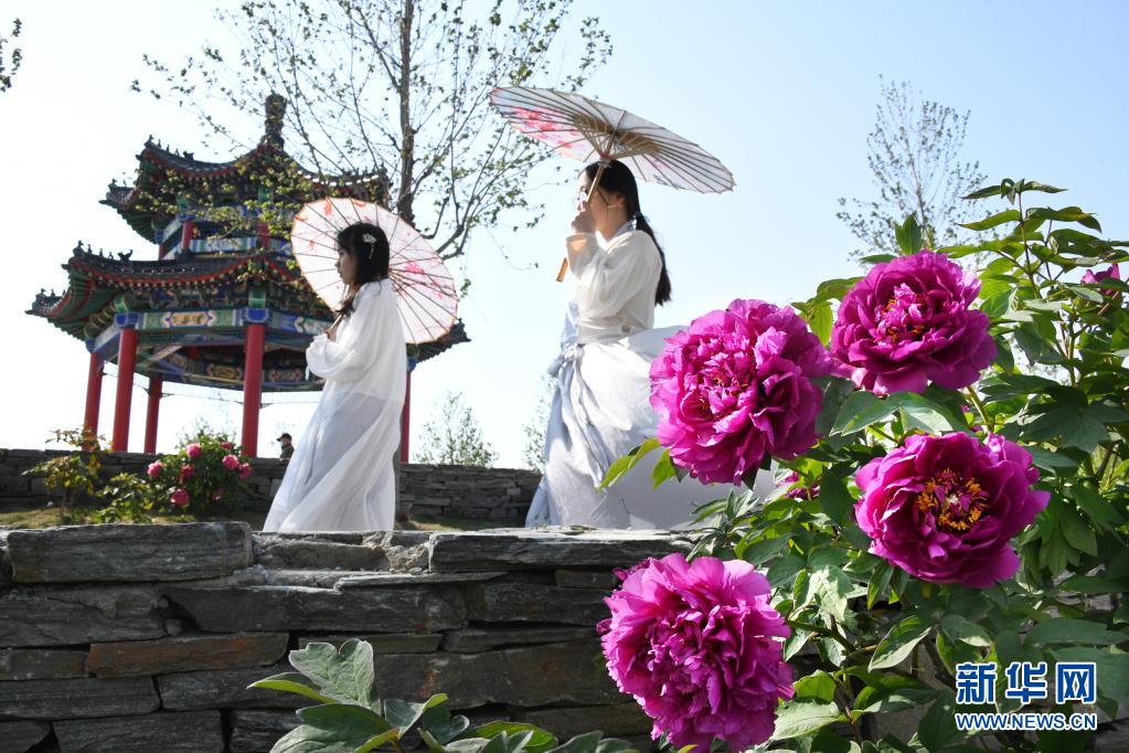 5月1日,兩名女孩身著漢服在牡丹園內穿行。