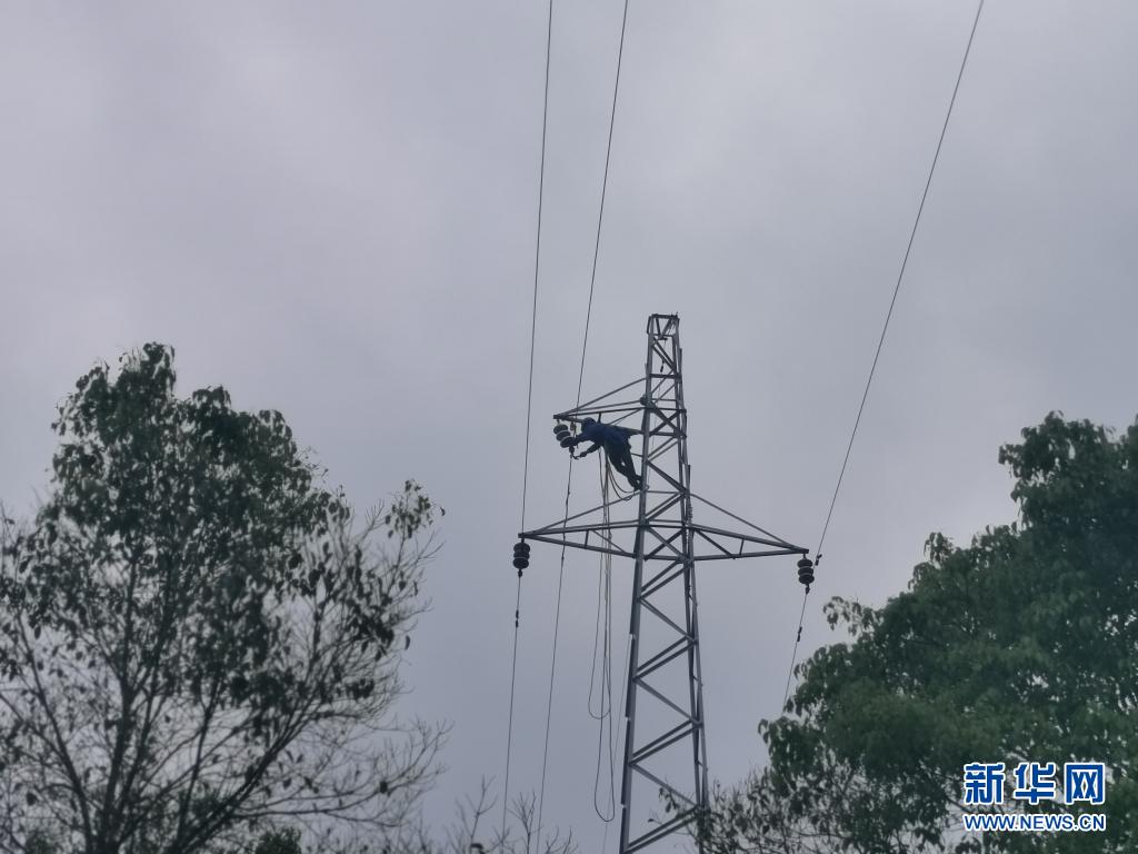 “跑山電工”黨員服務隊隊員在塔上連接線路(5月3日攝)。
