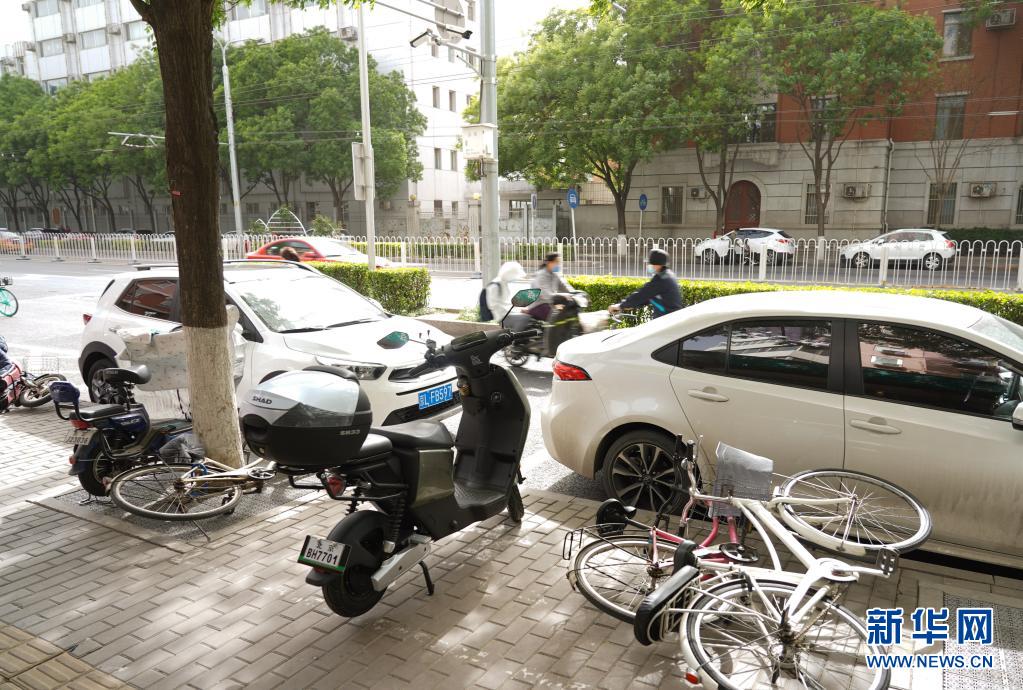 5月6日,在北京市西城區(qū)長(zhǎng)椿街,路邊停放的自行車被大風(fēng)吹倒。