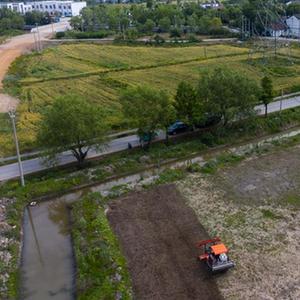 在東林鎮(zhèn)保永村,種植戶操作旋耕機(jī)耕地,準(zhǔn)備播種水稻(5月7日攝,無(wú)人機(jī)照片)。