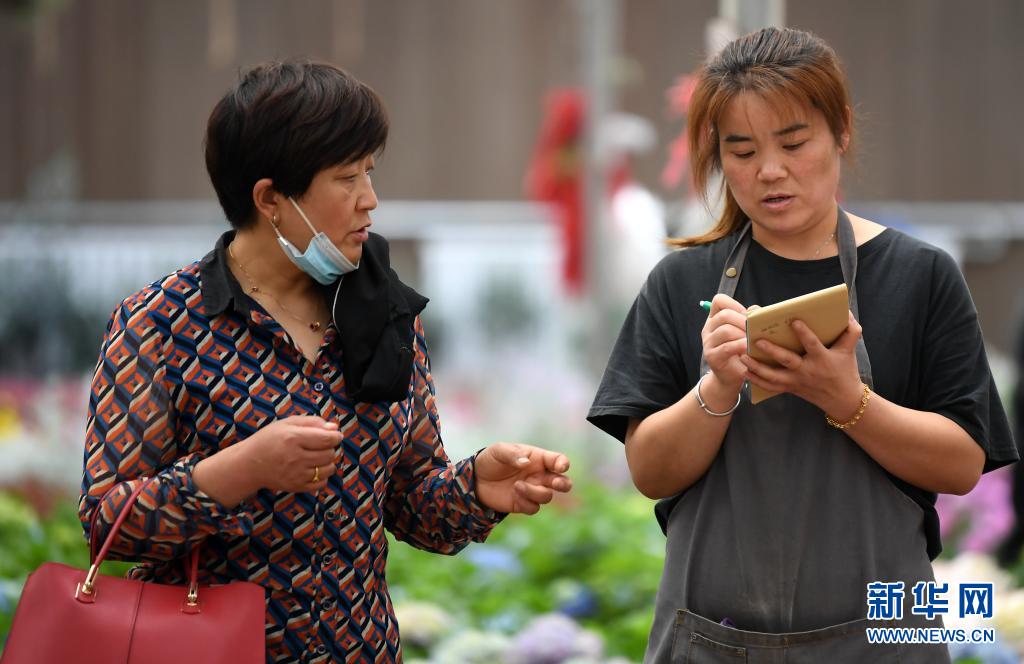 5月7日,在秦嶺花世界現(xiàn)代農業(yè)園區(qū),銷售人員在給顧客計算花卉價格。